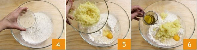 Sift the two types of flour into a large bowl and add the dissolved yeast 4, egg, mashed potatoes 5, and oil 6.