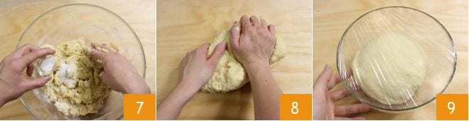Knead with your hands and add the salt 7; continue to knead until you obtain a smooth and homogeneous dough 8. Place the dough in a bowl covered with plastic wrap 9 and let it rise for about 2 hours in the oven turned off with the light on.