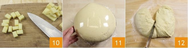 Meanwhile, cut the cheese into cubes 10. When the dough has doubled in volume 11, transfer it to a floured work surface and divide it in half 12.