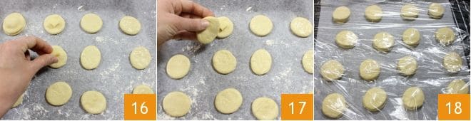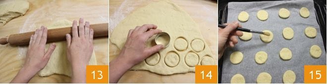 Roll out the first piece with a rolling pin into a sheet half a centimeter thick 13 and use a pastry cutter with a diameter of 2 inches to make 20 circles 14. Place them on a baking sheet or tray lined with parchment paper and lightly floured. Brush them with egg white 15 and