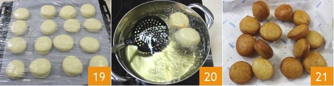 Heat the seed oil (the temperature should be about 350°F) and when your doughnuts are puffy 19, fry them in hot oil (350°F) for a few minutes, turning them so they brown on both sides 20. Drain and place them on a tray with paper towels 21. Before serving, sprinkle with salt and black pepper: the savory doughnuts with potatoes and Emmentaler are ready to be enjoyed!