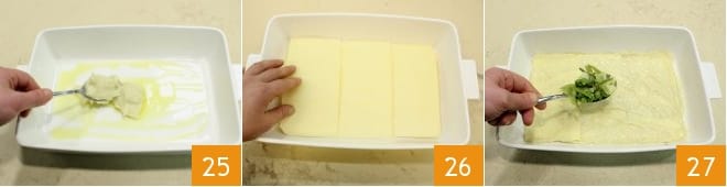 At this point, everything is ready to assemble the lasagna: take a baking dish measuring 12x8 inches, brush the bottom with olive oil, then spread a layer with the scallion-flavored béchamel sauce 25, arrange the pasta sheets vertically 26 and start adding the vegetables 27