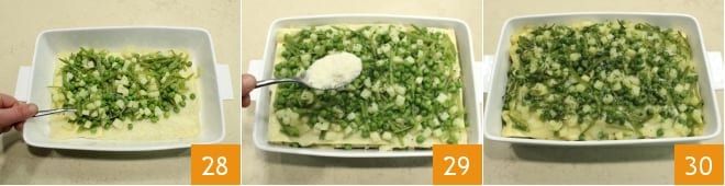 to create an even layer 28; season with the herb mixture and grated Parmesan. Proceed again by placing another layer of pasta and continue alternating the ingredients until they are all used up. Finish with a layer of vegetables to season with grated Parmesan 29. Bake in a preheated static oven at 355°F for 30-40 minutes (or in a fan oven at 320°F for 20-30 minutes). When cooking is complete, take your lasagna with green beans, potatoes, and peas out of the oven, let them cool slightly, and then serve them 30!