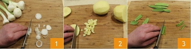 To make the lasagna with green beans, potatoes, and peas, start by washing the scallions, then clean and finely slice them 1. Wash, peel the potatoes, and dice them 2, making sure to keep them immersed in a bowl of water to prevent browning. Wash the snow peas and green beans, trim the ends, and cut them into strips 3.