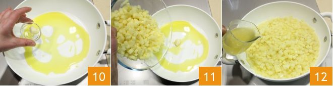 Place a large pan on the stove, heat a drizzle of olive oil and flavor with a garlic clove 10, then add the potatoes 11, drained from the water, cook them for about 10 minutes, pouring in a bit of broth to prevent the vegetables from drying out too much 12.