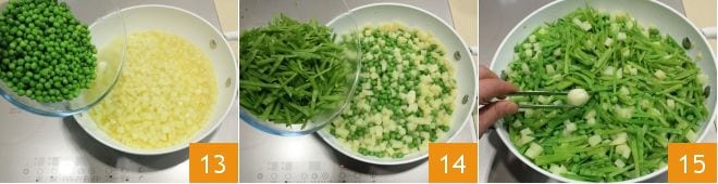 Then add the shelled peas 13, snow peas, and green beans 14. Continue cooking for another 5 minutes. The vegetables should not fall apart but remain crunchy. Season with salt, pepper, and remove the garlic clove with kitchen tongs 15