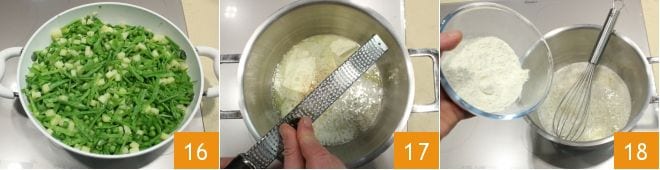and set aside the cooked vegetables 16. Now you can focus on the béchamel sauce (to make it perfectly, consult our guide on Béchamel sauce): place the butter in a saucepan, melt it over low heat, flavor with nutmeg 17, and add the sifted flour 18, cooking everything for a few minutes,
