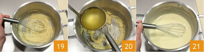 stirring continuously with a whisk until you obtain a creamy, lump-free mixture 19. At this point, remove the saucepan from the heat and add the hot broth 20 to the mixture, stirring everything with a wooden spoon. Then, put the saucepan back on the stove, cook on low heat until the sauce starts to boil, and add a pinch of salt. Cook the béchamel sauce, always on low heat, for 15 minutes, the necessary time for the sauce to thicken 21, stirring occasionally.