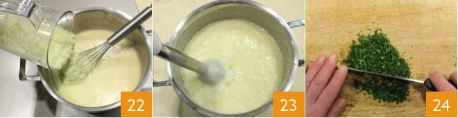 Once the béchamel sauce is ready, incorporate the previously prepared scallion sauce 22, blend the mixture with an immersion blender to combine the cream 23 and set aside. Finally, finely chop the aromatic herbs 24.