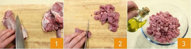 To make lasagna with lamb ragout, start by removing the fat from the meat 1, then cut it into small cubes 2, place it in a bowl and add the olive oil 3