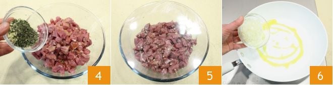 and the chopped herbs 4 (sage, bay leaf, rosemary, and garlic). Cover with plastic wrap 5 and let the meat marinate in the refrigerator for half an hour. In a large pan, heat a drizzle of olive oil, add the chopped onion 6 and let it wilt over low heat for a few minutes,
