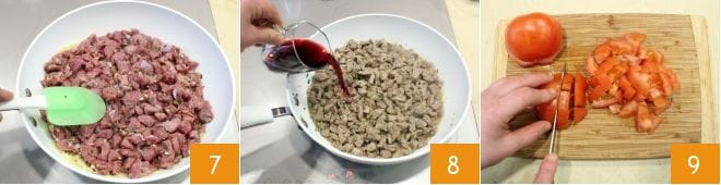 add the drained marinated lamb cubes 7, brown the pieces for 10 minutes, then deglaze with the red wine 8 and let it evaporate. Meanwhile, wash and dice the tomatoes 9,