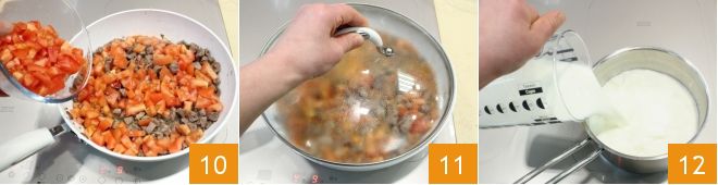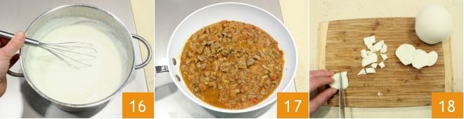 add them to the meat 10, salt and pepper, and continue cooking with the lid on for at least an hour 11. Meanwhile, prepare the béchamel: heat the milk in a saucepan 12 and season with nutmeg.