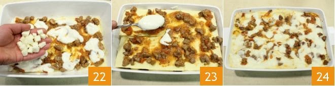 and the provola cubes 22, cover with béchamel and continue in the same way, alternating the layers until all ingredients are used up. Finish the lasagna with a layer of ragout and béchamel 23 and provola cubes. Bake the lasagna in a preheated static oven at 392°F for 30 minutes (or in a ventilated oven at 356°F for 20 minutes). Once cooked, remove your lasagna with lamb ragout from the oven 24, let them cool slightly, and then serve 27!