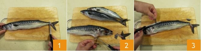 To prepare the lasagna with mackerel ragù and mushrooms, start by cleaning the fish. Take the gutted mackerel, rinse it under water and remove the tail 1, side fins located near the fish's head 2, and dorsal fins 3. Then turn the fish over and also remove the other side fins.