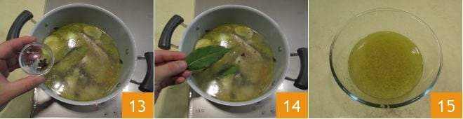 Finally, add the peppercorns 13 and bay leaf 14: allow to cook for another 5-10 minutes for the broth to become aromatic. Once cooked, turn off the heat, strain it and set the broth aside in a bowl 15.