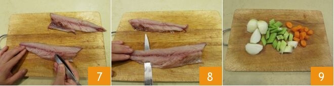 Now take the kitchen tweezers and remove the fish bones 7. Proceed by removing the skin from each fillet: slide the blade horizontally along the skin of the fish and its flesh, proceeding gently to separate them 8. Place the fish scraps in a bowl and set them aside, place the mackerel fillets in another bowl covered with plastic wrap and keep them in the refrigerator for now. At this point, focus on the broth, washing, and drying vegetables and aromatic herbs. Then roughly chop celery, carrots, and onion 9.