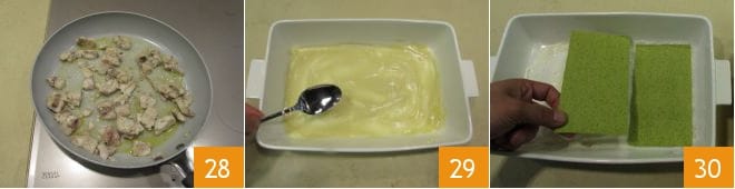 When the wine has evaporated, turn off the heat 28: it will take about 2 minutes of cooking. Now you have all the ingredients ready and can begin assembling the lasagna. Pour a thin layer of béchamel into a 8x12 inch pan and drizzle with some oil 29. Place the green lasagna sheets over the béchamel, completely covering the surface of the pan 30.
