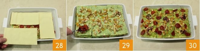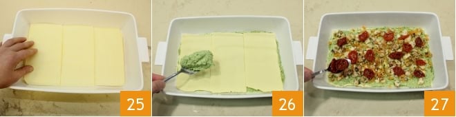 Lay 3 sheets on the bottom 25 and cover with another layer of pesto 26 and a layer of octopus ragù; lastly, distribute some confit cherry tomatoes 27.
