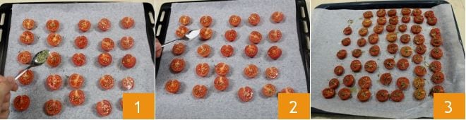 To prepare the lasagna with octopus ragù, start with the Cherry Tomatoes Confit: wash and halve the cherry tomatoes, distribute them on a baking sheet lined with parchment paper with the cut side facing up; salt and pepper to taste. At this point, prepare a mix of thyme and oregano and sprinkle it on the cherry tomatoes 1; also add the sugar 2. Finally, drizzle with a little oil and bake in a preheated static oven at 285°F for about 2 hours, until the cherry tomatoes' water has evaporated, and they are slightly roasted but not dry 3.
