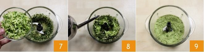 Add the grated Grana Padano and blend everything; add a drizzle of oil and a pinch of salt to taste. Add the drained zucchinis 7, pour another drizzle of oil 8, and complete the pesto with a final pulse of the blades 9.