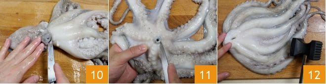 Now focus on the octopus ragù, starting with the How to Clean and Cook Octopus: rinse it under running water, then place it on a cutting board and with a knife, cut the sac at eye level 10 to remove them. Then remove the octopus's beak: with a small knife, start cutting around the mouth 12; tenderize the octopus meat by pounding it with a meat mallet 12. Then remove the innards from the sac and wash it thoroughly;