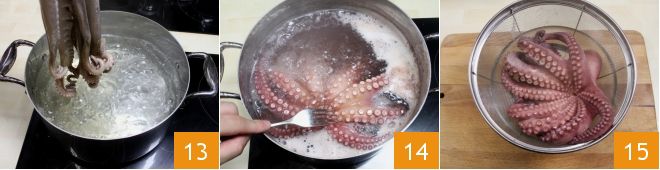 Now you can proceed with the cooking: bring water to a boil in a large pot and immerse the octopus 13; cook it for about 40 minutes (for every 500 g of octopus, it takes 20 minutes of cooking). While it cooks, you can remove the residues and foam from the cooking water surface with a slotted spoon. Before draining it, pierce the meat with the tines of a fork to check if it is the right time to remove it from the heat 14. Once cooked, you can drain it and let it cool slightly 15.