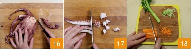 Then transfer it to a cutting board and start cutting it: separate the head from the tentacles and set it aside, cut the tentacles 16 into more or less large pieces 17. Also, cut the head into strips. Then prepare the ingredients for the soffritto, celery, carrot 18, and onion.