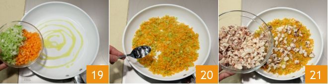 Pour the chopped vegetables into the pan with a drizzle of oil 19 and sauté, adding a little water to facilitate cooking and prevent the vegetables from burning 20. After about 10 minutes, add the chopped octopus pieces 21.