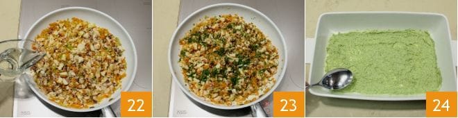 Salt, pepper to taste and deglaze with white wine 22. Cook for about 20-25 minutes, then turn off the heat and sprinkle with freshly chopped parsley 23. Now that all the ingredients are ready, take a 20x30 cm baking dish, grease it with a little oil, and create a layer with the zucchini pesto 24.