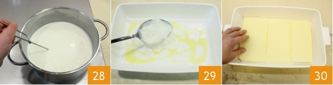 Then continue mixing with the whisk to thicken the béchamel over low heat 28. Take a 12x8 inch baking dish and drizzle it with a little oil; distribute a layer of béchamel 29 and place a layer of lasagna 30.