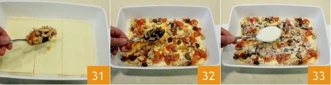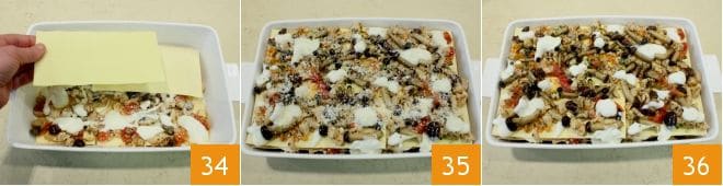 Layer with a layer of rabbit ragù 31, one of mushrooms 32, then proceed by sprinkling with grated Parmesan and a few tablespoons of béchamel 33.