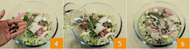 the sage leaves, rosemary sprigs, thyme leaves, and juniper berries 4; then cover everything with white wine 5 and let it marinate for at least two hours or overnight 6, covered with plastic wrap and in the refrigerator.