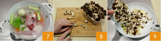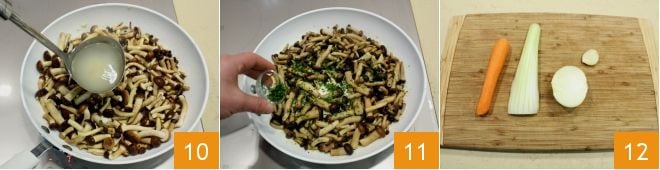To prepare the broth, pour the water into a pot, then add the rabbit bones, onion, celery, carrot, and a pinch of salt: simmer over very low heat for at least 1 hour. Meanwhile, dedicate yourself to the mushrooms: clean the mushrooms by cutting off the end part 8, wash them; then blanch them for 15-20 minutes before pouring them into a large pan where you have lightly sautéed the chopped garlic with a drizzle of oil 9.