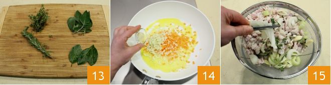 Do the same with garlic, sage, thyme, bay leaf, and rosemary 13. Drizzle a wide pan with a little oil, then add the chopped onion, celery, carrot, and the clove of garlic 14 and let the sauté simmer over low heat. Carefully drain the rabbit from the marinade, removing the aromatics 15.