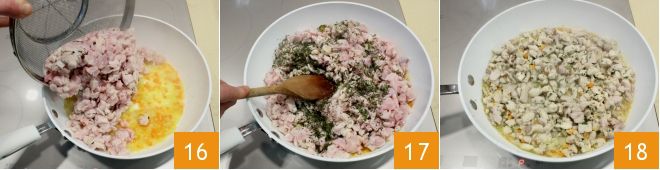 When the sauté is wilted, add the rabbit 16 and the chopped aromatic herbs 17, then let it brown for 10-15 minutes 18.