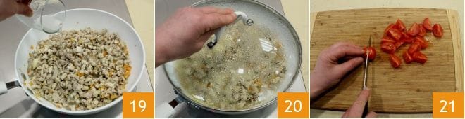 Deglaze the meat with white wine 19, let it evaporate, then add the rabbit broth from time to time, cooking with the lid on 20, until the meat is very tender: it will take about 1 hour. Towards the end of cooking, wash and cut the cherry tomatoes into wedges 21,