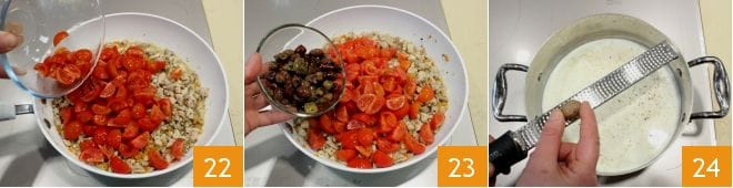 add them to the rabbit ragù 22, then also add the pitted Taggiasca olives 23. Adjust with salt and pepper, then turn off the heat. Then focus on the Béchamel sauce: in a saucepan, heat the milk, flavor it with grated nutmeg 24, and salt and pepper to taste.