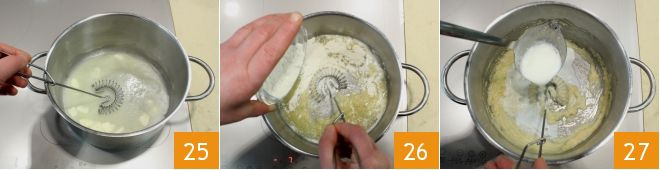 In another large saucepan, pour the butter and let it melt over low heat 25; once melted, sprinkle in the flour 26 and mix with a whisk to create the roux. When the mixture has slightly darkened and become more dense, pour in the hot milk 27.