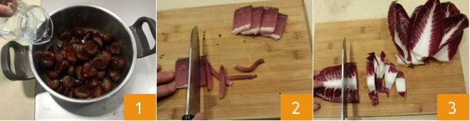 To make the lasagna with radicchio, chestnut cream, and speck, start by cooking the chestnuts: rinse them and place them in a pot, cover them with water 1, and boil for about 40 minutes. Meanwhile, cut the speck into thin strips 2, remove the tougher part of the radicchio stem, wash the leaves, and cut them into strips about 0.5 inches thick 3,
