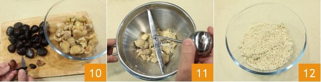 drain them, peel them with a paring knife, and collect the pulp in a bowl 10, then pass it through a food mill (11-12).
