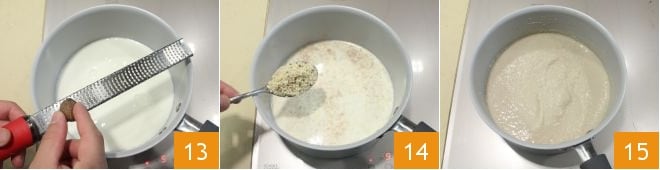 In a pot, place the milk, flavor it with nutmeg 13, and add a pinch of grated salt, bring it to a boil, then add the chestnut puree 14 and continue cooking for 6-7 minutes, stirring continuously until the cream thickens 15.