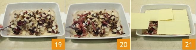 then add the radicchio 19 and the speck 20. At this point, place 4 pasta sheets on top in the opposite direction 21