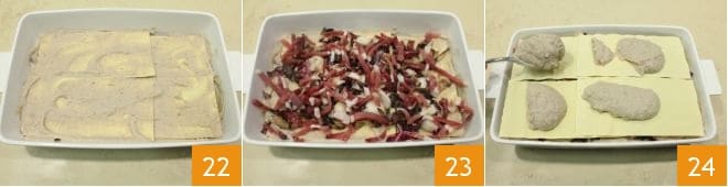 spread the chestnut cream on top 22, the radicchio, and the speck 23. Finish with a final layer of 4 pasta sheets and dress as before with chestnut cream 24, radicchio, and speck.