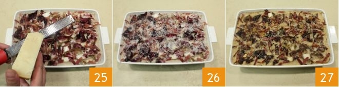 Finally, season with grated Grana Padano (25-26). Bake the lasagna with radicchio, chestnut cream, and speck in a preheated static oven at 425°F for 20 minutes (or a convection oven at 390°F for 10 minutes) and grill for a couple of minutes once nearly cooked. Remove the lasagna with radicchio, chestnut cream, and speck from the oven 27 and let them cool slightly before serving.