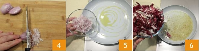 peel the shallot and chop it finely 4. In a pan, sauté the chopped shallot with a drizzle of olive oil for 10 minutes 5, then add the radicchio 6