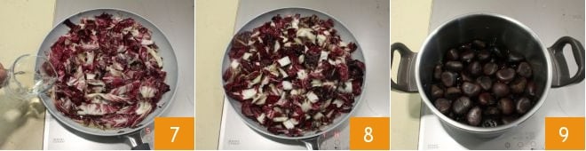 season with salt and pepper, deglaze with white wine 7 and continue cooking for a few minutes. Once cooked, turn off the heat and let it cool slightly 8, meanwhile, the chestnuts will be ready 9