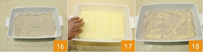 Everything is ready to assemble the lasagna: take an 8x12 inch baking dish, spread a layer of chestnut cream on the bottom 16, take the pasta sheets, and place three on the bottom 17, then continue with another layer of cream 18