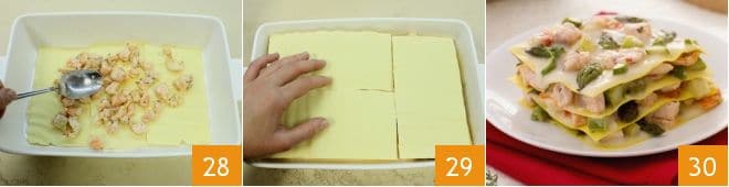 Continue with a layer of béchamel and then again the pasta sheets, prawns, and salmon 28 and asparagus. Continue in the same order 29 until you finish the ingredients. Then bake the lasagna in a static oven at 392°F for 12 minutes. Take out the salmon, prawn, and asparagus lasagna and serve them hot 30!