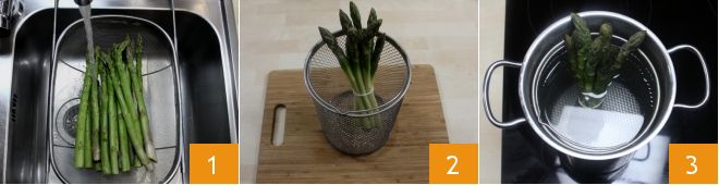 To prepare the salmon, prawn, and asparagus lasagna, start with cleaning the asparagus. Rinse them under running water 1, then remove the fibrous part of the stalk with a vegetable peeler, cut off the tough end with a knife to even them out, and tie them with kitchen string 2. Boil them in an asparagus steamer, leaving the tips out of the water 3 (or cook them in a shallow and wide pot fully submerged without needing to tie them together) for about 10-15 minutes.